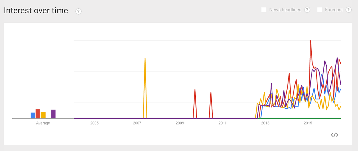 First, let’s use Google Trends to view the keyword volume and trajectory simultaneously. You can enter all of the keywords at the same time and see them graphed against each other. For my keywords it looks like this: