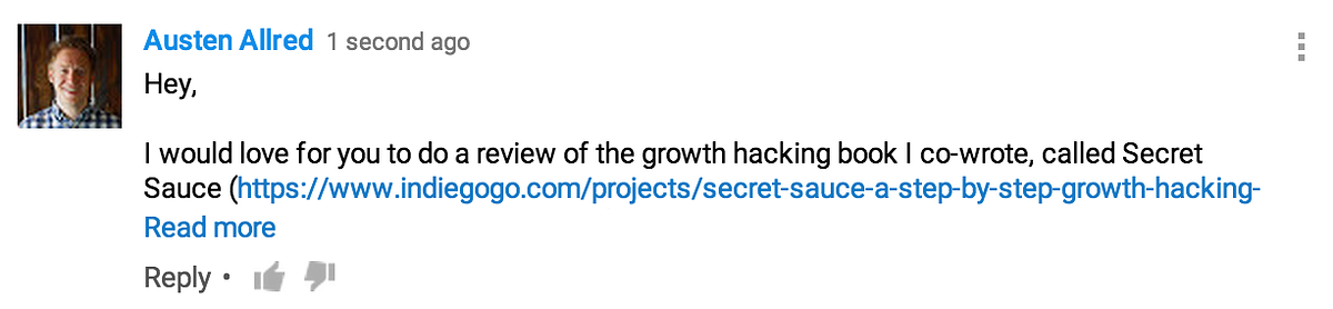 It’s a review of another book about growth hacking. All I had to do was comment, tag the author, ask him if he were willing to review our book, and offer to send him one for free. (If you’re reading this now it’s going to be pretty awkward).