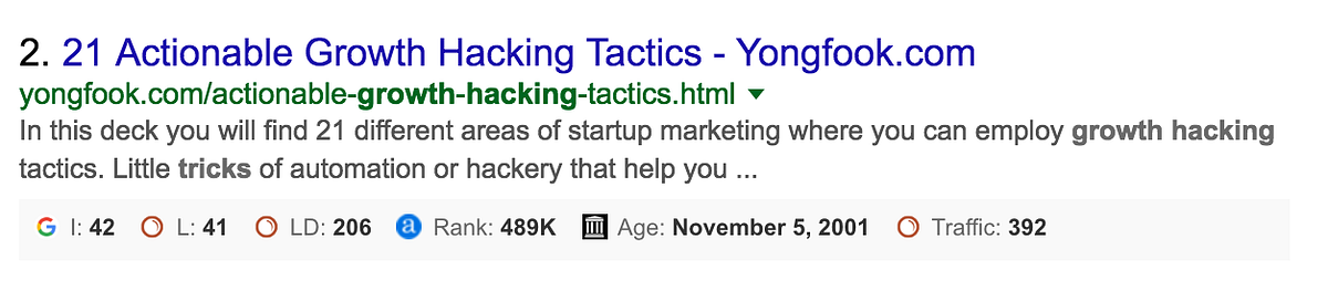 But the word “tactics” doesn’t even appear here. This page isn’t optimized for this keyword, so I could probably knock it out by being optimized specifically for “growth hacking tactics.”