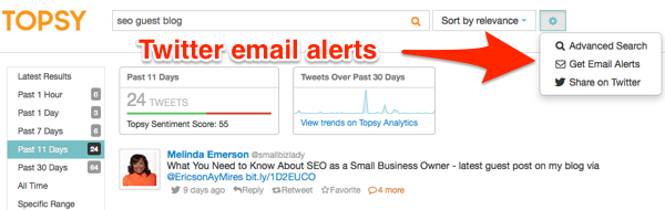To automate the guest blogging research process, you can use social media, Twitter to be more exact. I recommend you to use medium, which can send email alerts when keywords you want to track, are posted on Twitter. For example, to get email alerts when someone on Twitter mentions a keyword like ‘seo guest blog’, click on the Settings icon and then on ‘Get email alerts’.