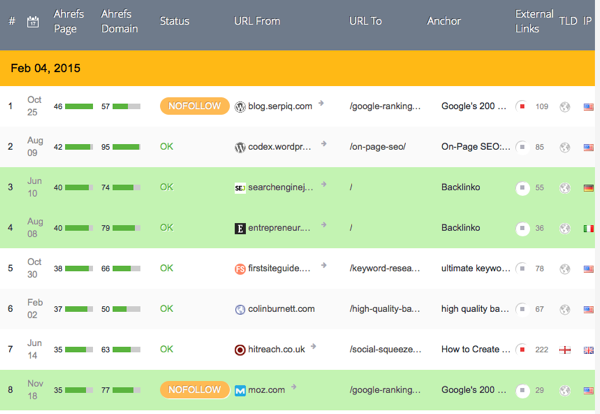 By spying them, obviously. You have to be up to date with all the backlinks they are building or earning, and try to replicate them. For this, you can use one of my favorite SEO tools, which is called Monitor Backlinks. After connecting your account with Google Analytics and adding your competitors, you get a list with all the websites that are linking to them. The feature I find the most useful is that it automatically compares your links with your competitor’s, and highlights with green the ones you have in common. Take this screenshot, for example:
